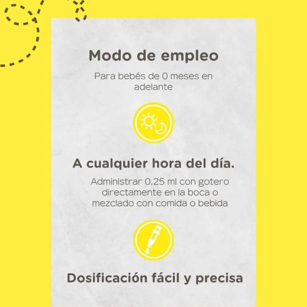 Administrar la dosis indicada con la jeringa dosificadora incluida, o según las indicaciones del profesional de la salud. Puede administrarse directamente en la boca del bebé o mezclarse con alimentos o líquidos, según recomendación médica.