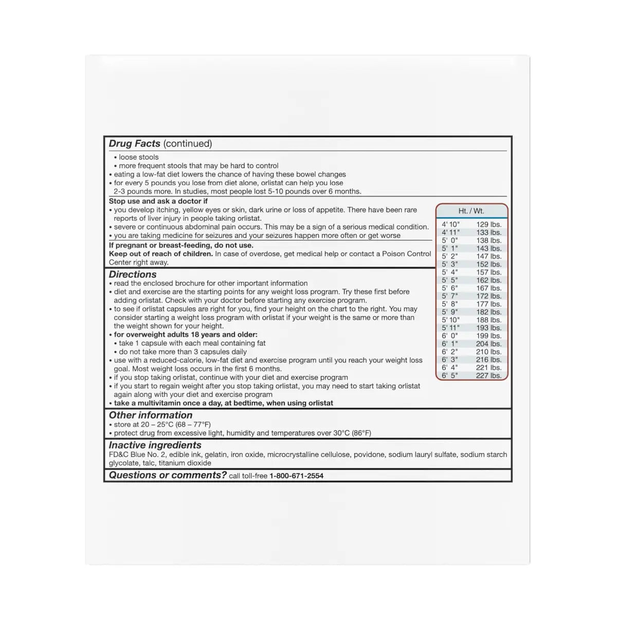 Alli Orlistat Weight Loss Aid 60 mg 60 Cápsulas es un suplemento dietético auxiliar en la pérdida de peso que ayuda a bloquear aproximadamente el 25% de la grasa consumida en la dieta. Está diseñado para hombres y mujeres adultos con sobrepeso que siguen un plan de alimentación bajo en calorías y grasas, acompañado de actividad física regular. Actúa directamente en el tracto digestivo, con mínima absorción en el torrente sanguíneo, por lo que tiene poco o ningún efecto sobre el sistema cardiovascular y nervioso central.