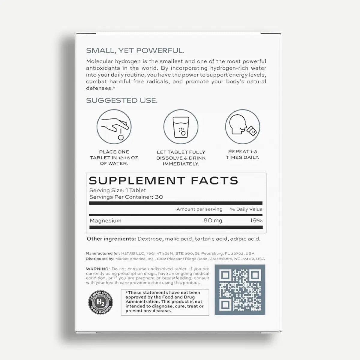 Molecular H2TAB es un suplemento dietético formulado para producir agua enriquecida con hidrógeno molecular, conocido por su capacidad antioxidante y su apoyo a la función celular. Estas tabletas ayudan a aumentar la energía natural, mejorar la claridad mental, promover la recuperación física y favorecer un envejecimiento saludable gracias a su capacidad para combatir el estrés oxidativo.*