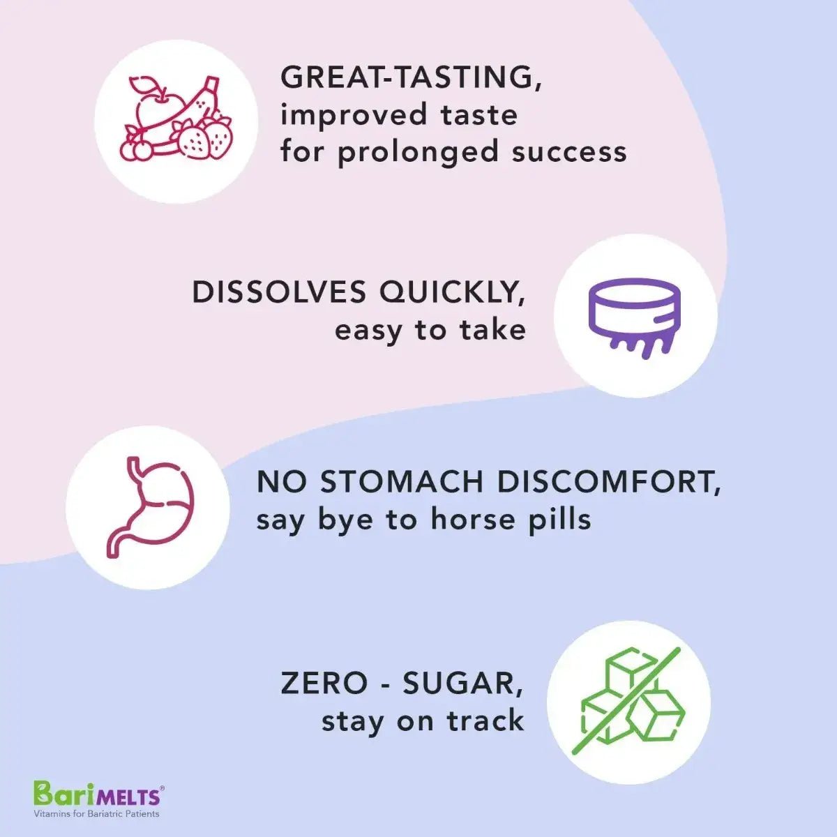 Barimelts® Multivitamin 60 Fast-Melting Tablets es un suplemento dietético diseñado especialmente para cubrir las necesidades nutricionales de pacientes bariátricos. Su fórmula completa de vitaminas y minerales apoya la salud integral y ayuda a compensar las deficiencias comunes tras la cirugía.